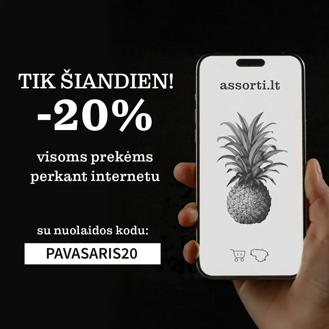 Nuolaidos kodas PAVASARIS20 galioja tik assorti.lt internetinėje parduotuvėje. Nuolaida netaikoma dovanų rinkiniams, pieno mišiniams, alkoholiui, dovanų kuponams, tarai, pristatymo ir pakavimo mokesčiui. Nuolaidos kodas galioja iki 23:59 val. Nuolaidos nesumuojamos. Prekių kiekis ribotas.
